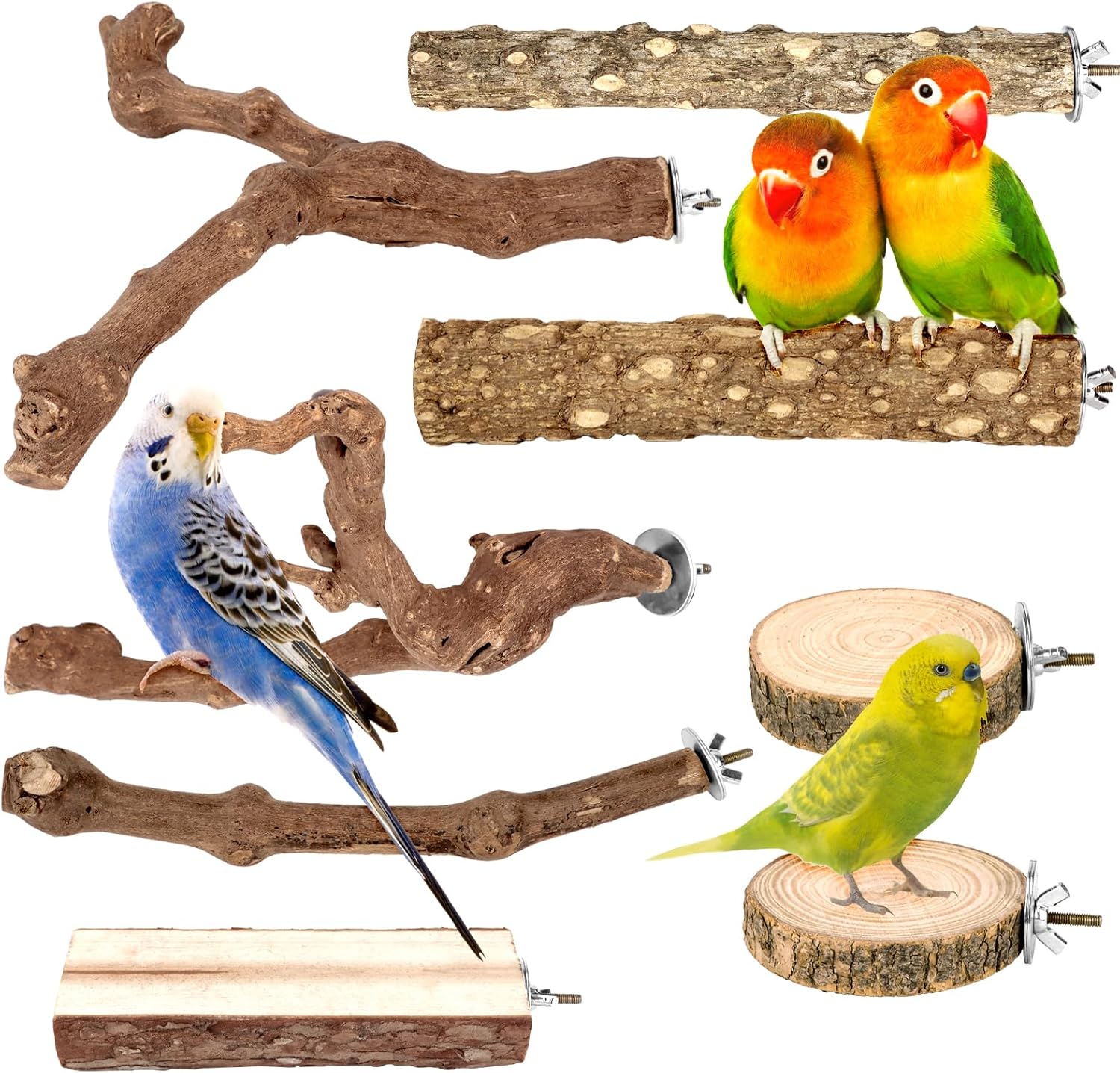 - Diverse 8-Piece Perch Collection Complete set includes: 2 forked grapevine branches (9.8") + 1 straight grapewood perch (9.8") + 2 prickly ash sticks (7.9") + 1 rectangular platform (6"x3") + 2 round perch bases (2.4"). Creates dynamic climbing zones for natural avian behaviors.