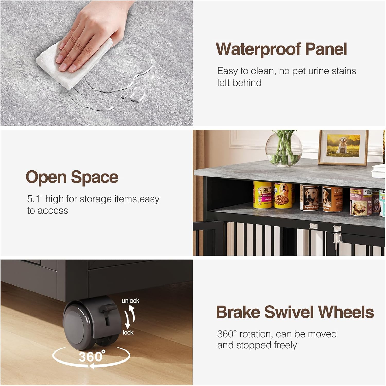 - Furniture-Style Dog Kennel:With a storage shlef, it serves as both a stylish dog crate and a practical side table. It provides space to store dog supplies and decorate your house at the same time! Equipped with 360° lockable wheels, you can easily move it around your house for different needs.