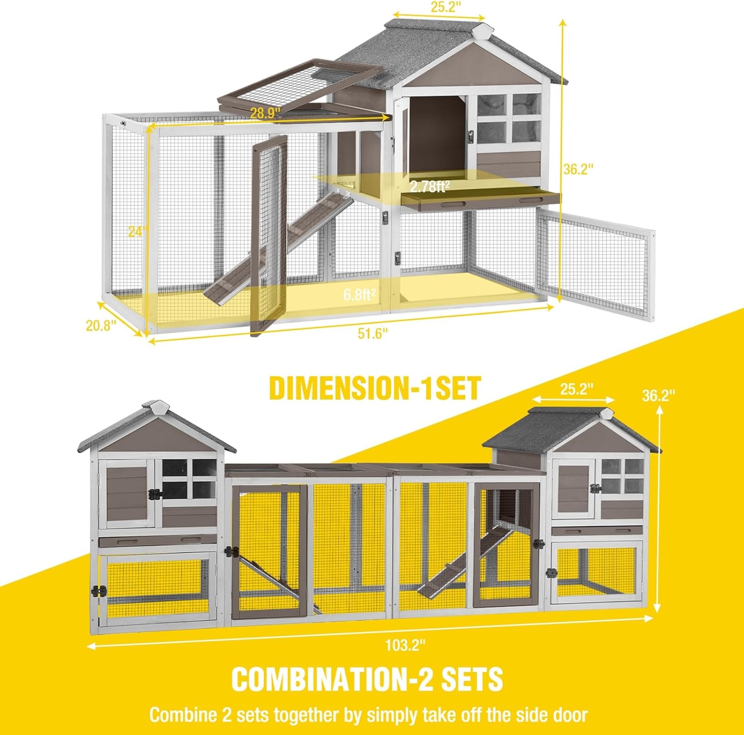 Aivituvin Large Rabbit Hutch Indoor Bunny Cage Outdoor with Run Chicken Coop Guinea Pig House with Waterproof Asphalt Roof,No Leakage Pull Out Tray (103.2" L x 25.2" W x 36.2" H,Brown-2 Sets)
