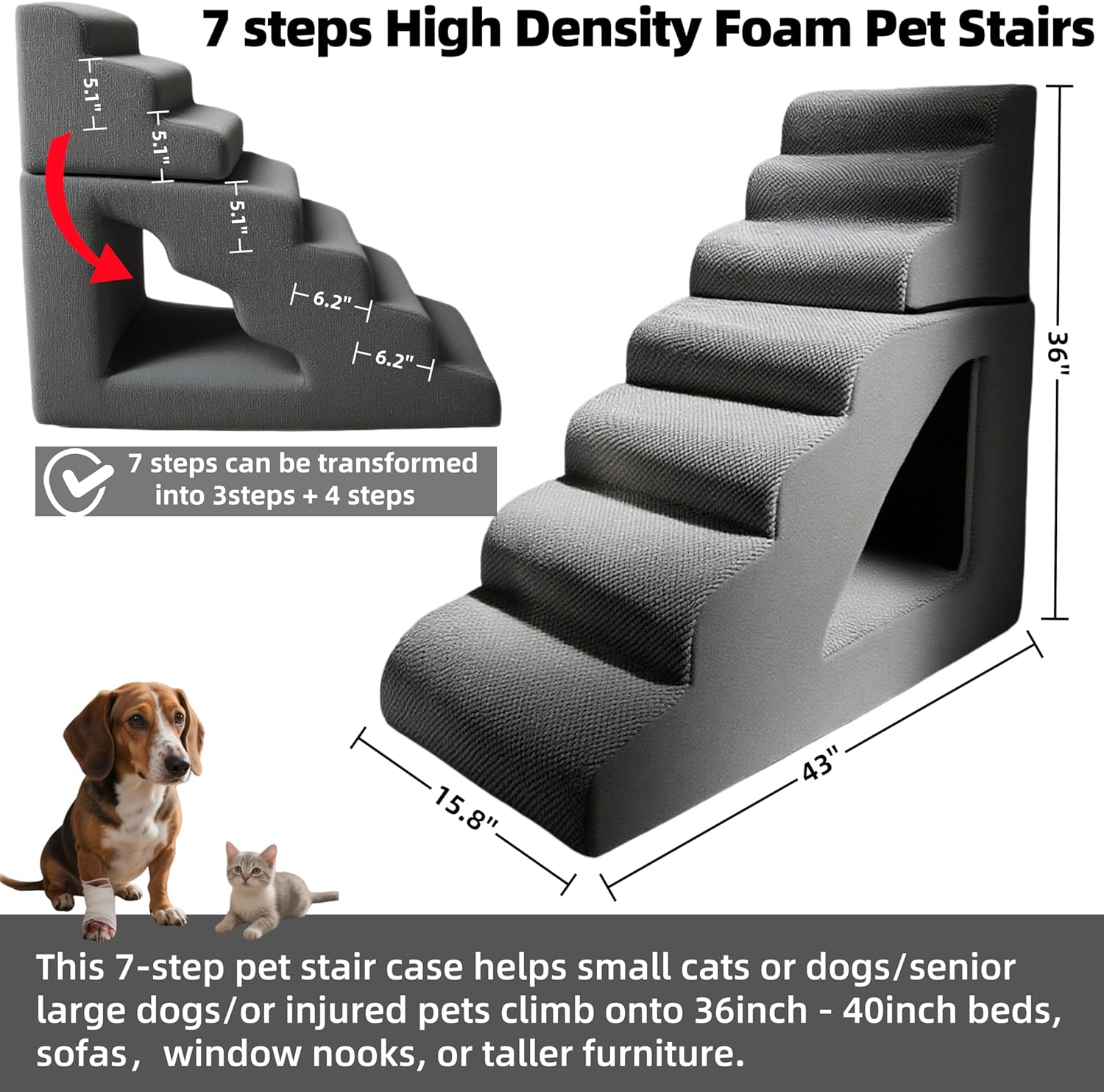 7 Step Pet Stairs Ramp for High Beds Sofas 22-42 Inch, Non-Slip Dog Stairs for Small Old Medium Large XL Dogs Cats, Sturdy 75 Pounds 33D Foam Balanced 6-Tier Ladder with Machine Washable Cover
