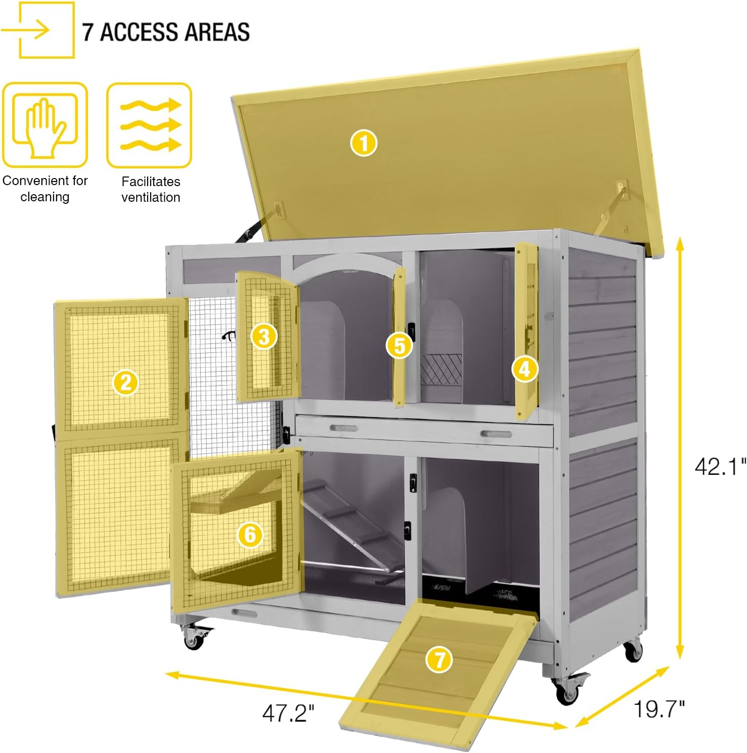 Aivituvin Rabbit Hutch Indoor, Bunny Cage with Wheels, 2-Story Design, 2 Deep Trays, Anti Slip Ramp, Ideal for Small Animals - Grey