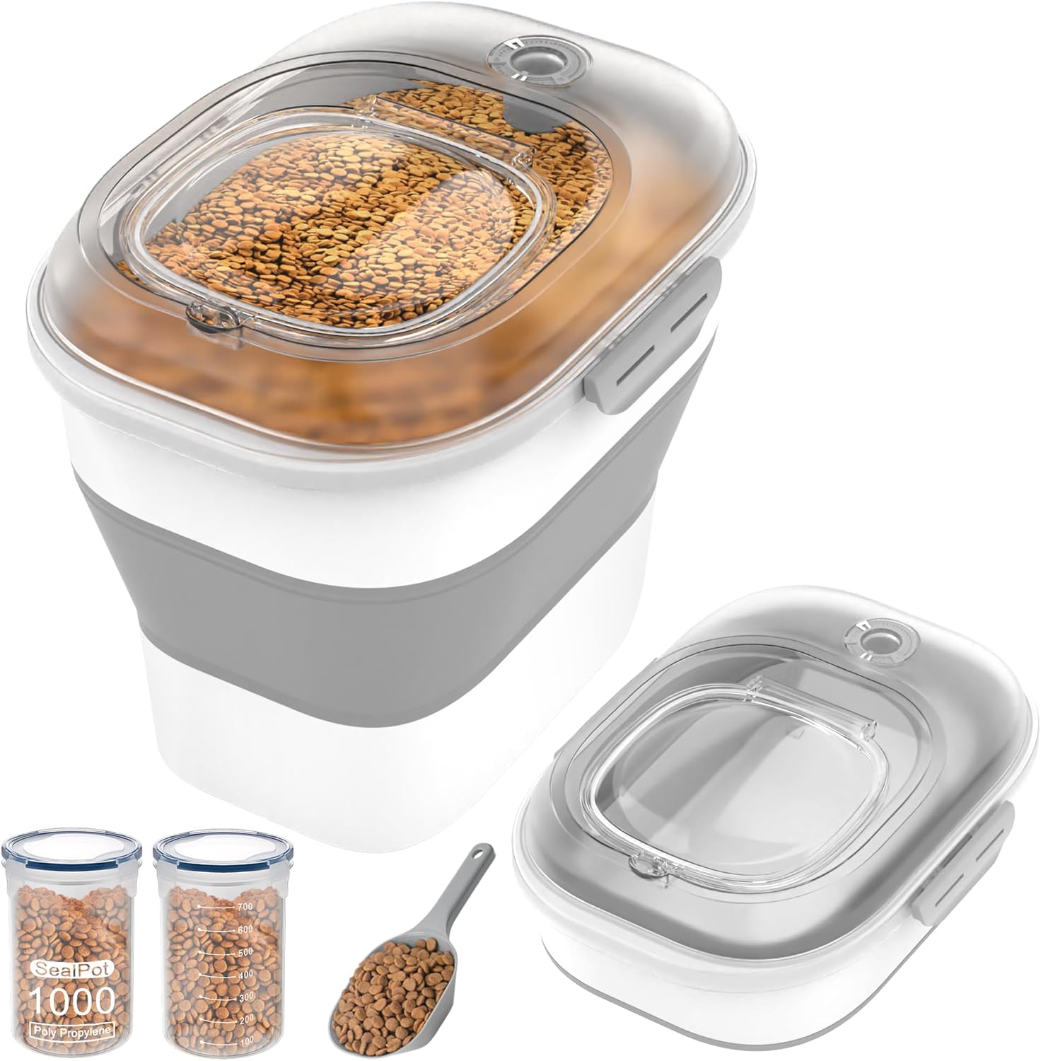 - Space Save & Extra-large Size: This dog food bin can hold 55 lbs of rice or 35 lbs of pet food storage. Unfolded size:17.7"L x 12.9"W x 14.7"H, 40Qt, suitable for storing 35 pounds of dog food. Folded size:17.7"L x 12.9"W x 6.2"H, 15Qt, can hold about 13 pounds of dog or cat food storage.