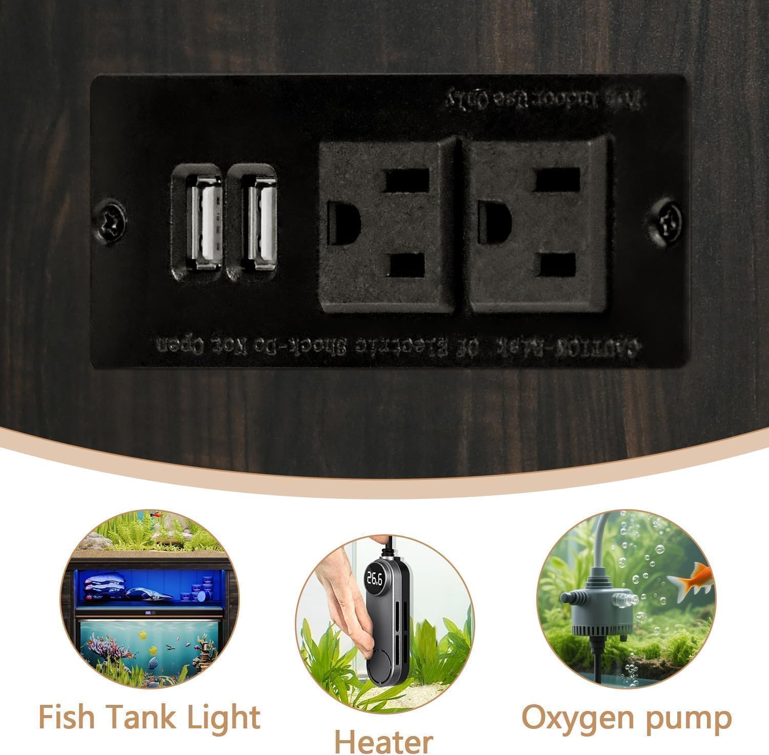 - Power Outlet and USB Charging Port: This aquarium stand has built-in 2 power outlets and 2 USB ports, which can be used to power and charge your devices. This keeps wires organized and simplifies aquarium management