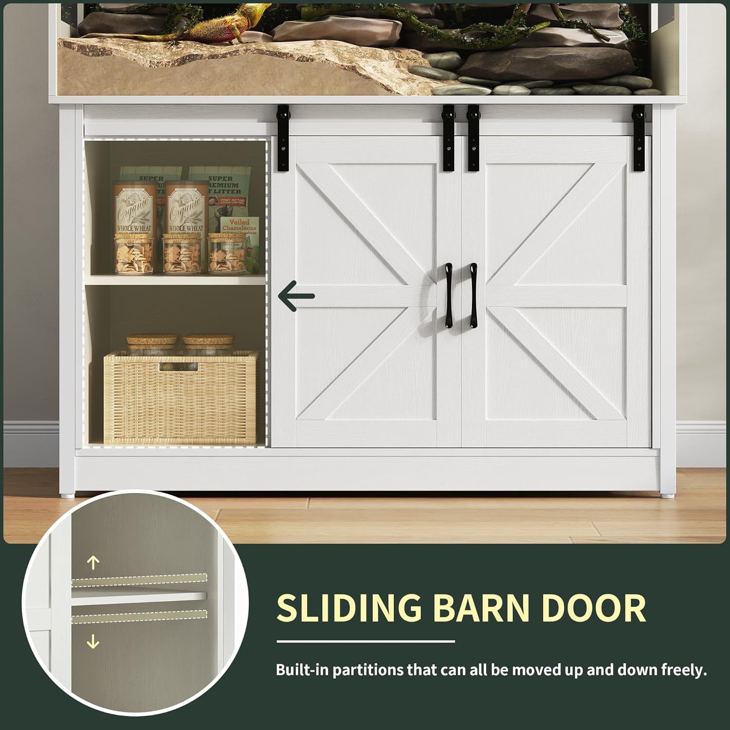 - [Storage Stand with Barn-Style Doors] The bottom cabinet includes side barn doors and a two-level middle shelf, giving you organized storage for UVB bulbs, heating mats, humidity gauges, substrate, and snacks. Keep your reptile supplies neat and accessible.
